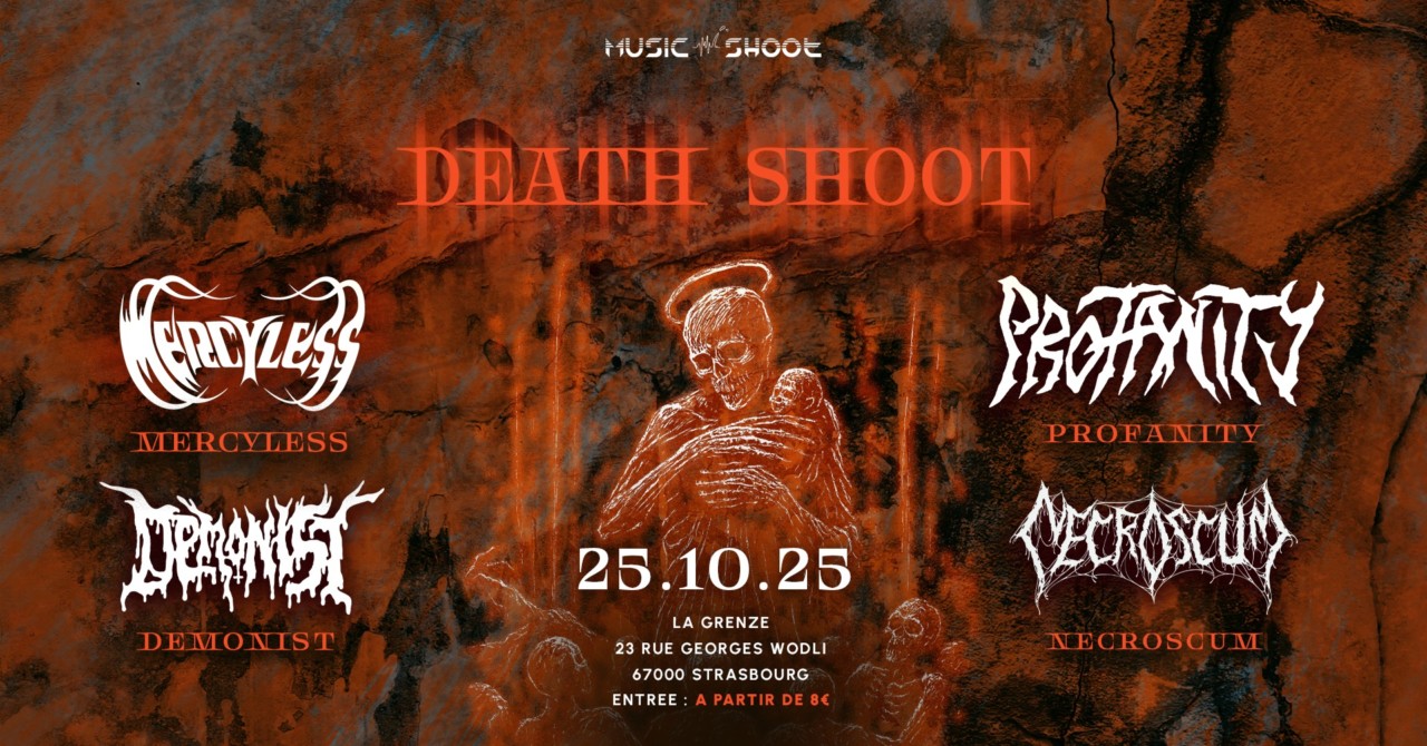 Le 25 octobre, la Death Shoot revient, cette fois-ci à La Grenze, avec pas moins de quatre groupes de death metal ! Pour l’occasion, les deux groupes légendaires Profanity et Mercyless seront accompagnés de Demonist et Necroscum.