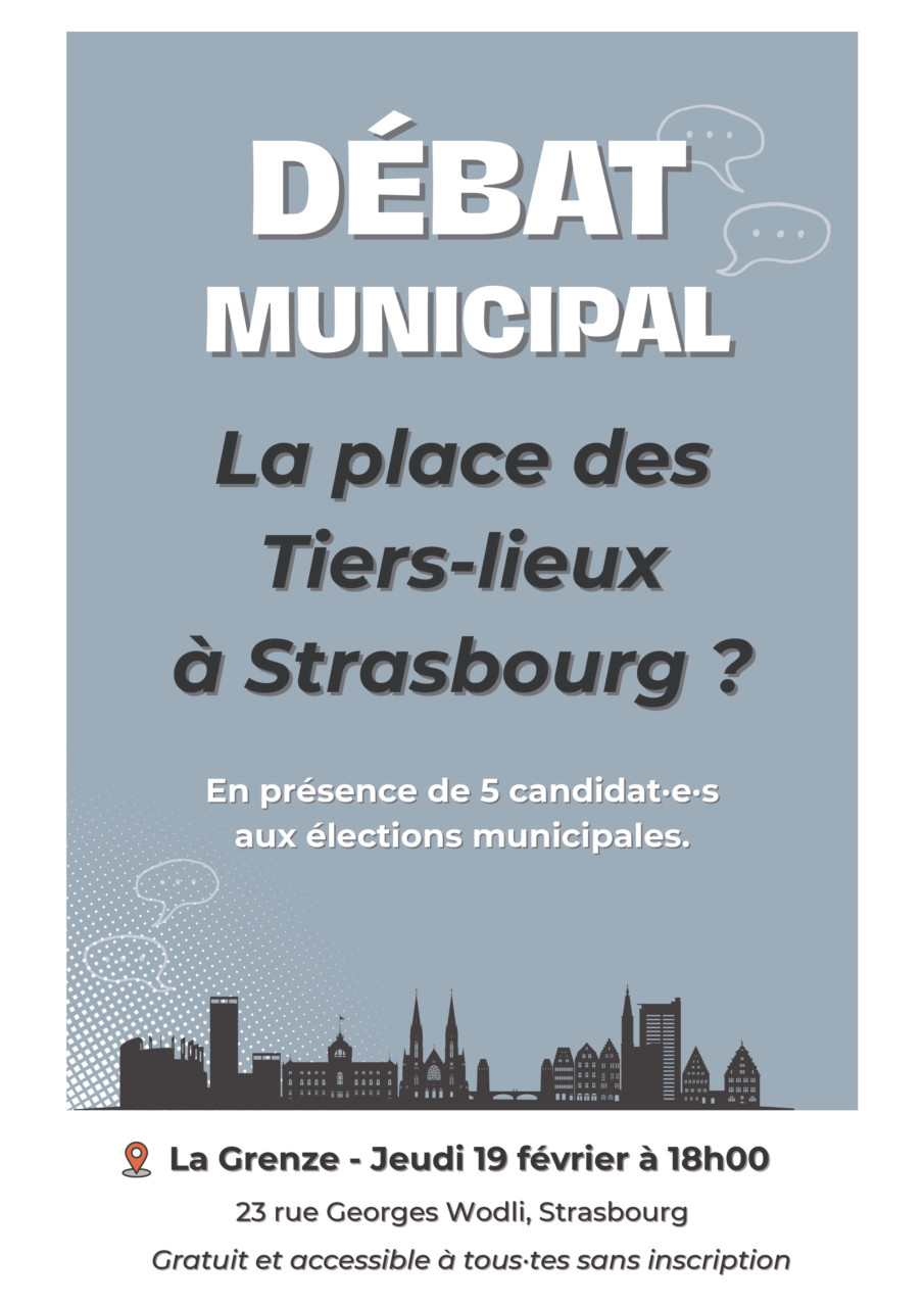 À l’occasion des élections municipales, La Grenze accueille un grand débat ouvert à tous·tes organisé avec plusieurs tiers-lieux de Strasbourg. Venez échanger avec les candidat·es sur leur programme concernant les tiers-lieux, leurs actions et leurs engagements.